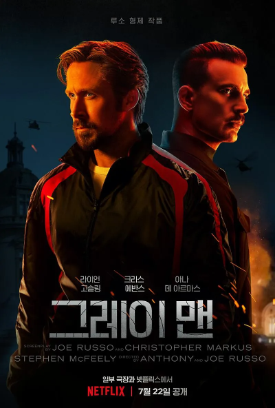 《그레이 맨》은 루소 형제가 연출하고, 라이언 고슬링과 크리스 에반스가 맞붙는 넷플릭스 블록버스터 액션 영화다. 비밀 작전의 최전선에 있던 요원이 CIA의 타깃이 되면서 벌어지는 숨 막히는 추격전과 강렬한 액션이 돋보인다. 스릴 넘치는 스토리와 스타일리시한 액션을 원하는 관객들에게 강력 추천한다.