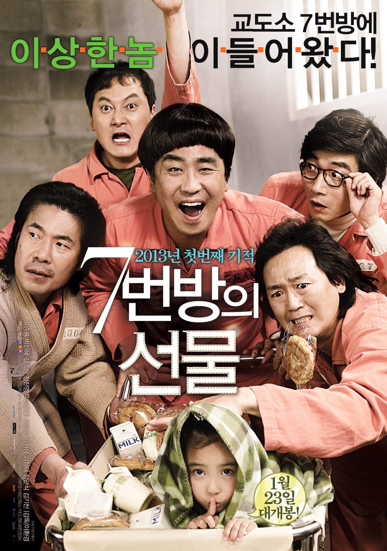 그렇게 들어간 교도소에서 배정받은 7번방에는 다양한 인물들이 나옵니다. 방장을 맡고 있는 밀수죄로 들어온 소양호와 사 기 전과로 교도소를 들어와 소양호의 오른팔역할을 하며 7번 방의 브레인 역할을 하는 최준호. 그 외에 부부이지만 소매치기 혐의로 들어온 신봉식. 7번 방의 막내이자 간통으로 들어온 강만범. 자해공갈로 들어왔으며 최고령 수감자인 서노인이 7번 방의 수감자들이다. 들어간 지 얼마 되지 않았을 때 용구는 아동성폭행 범죄를 저질렀다는 이유로 배정받은 교도소의 7번 방에서도 폭행과 멸시를 당했습니다. 그렇게 시간이 지나고 교도소의 운동장에서 7번 방의 방장인 양호가 운동을 하며 여가시간을 보내다 빡빡이로부터 목숨을 잃을 뻔한 양호를 구하면서 원하는 것은 뭐든 구해준다는 말에 용구는 고민 없이 예승이를 보고 싶다고 얘기합니다. 그렇게 교도소로 용구의 딸 예승이는 성가대를 통해서 7번 방에 들어오면서 아버지 용구를 다시 재회하게 됩니다. 7번 방의 수감자들은 용구와 예승이 와 함께 생활하면서 용구는 딸을 사랑할 뿐 사람을 죽일 만한 위인이 아니라는 것을 깨닫고 탄원서를 제출하는 등 용구를 무죄입증하기 위해 노력하지만 국선변호사의 어이없는 대처와 경찰청장의 압력 때문에 용구의 무죄는 인정되지 않습니다. 국선변호사는 당신이 죽어야 당신 딸인 예승이가 산다고 겁을 주었고 수감자들의 탄원서마저도 재판에서는 소용이 없다면서 받지 않았습니다. 경찰청장은 용구를 마구 구타한 다음 합당한 대가를 치르지 않는다면 당신 딸도 똑같은 꼴로 만들어 주겠다고 협박을 했습니다. 확실한 증거도 없음에도 불구하고 경찰청장은 딸을 잃었다는 슬픔하나로 무죄인 사람을 죽음으로 내몬 것이나 마찬가지입니다. 결국 용구는 딸을 지키기 위해서 경찰청장의 딸을 죽였다고 거짓 시인하면서 사형 확정 판결을 받습니다. 이후 억울한 판결을 받은 용구를 위해서 열기를 이용해 탈옥하는 것을 도와주었지만 밧줄이 철조망에 걸리면서 탈옥은 실패로 돌아가며 결국 용구는 판결받은 바와 같이 사형당한다.